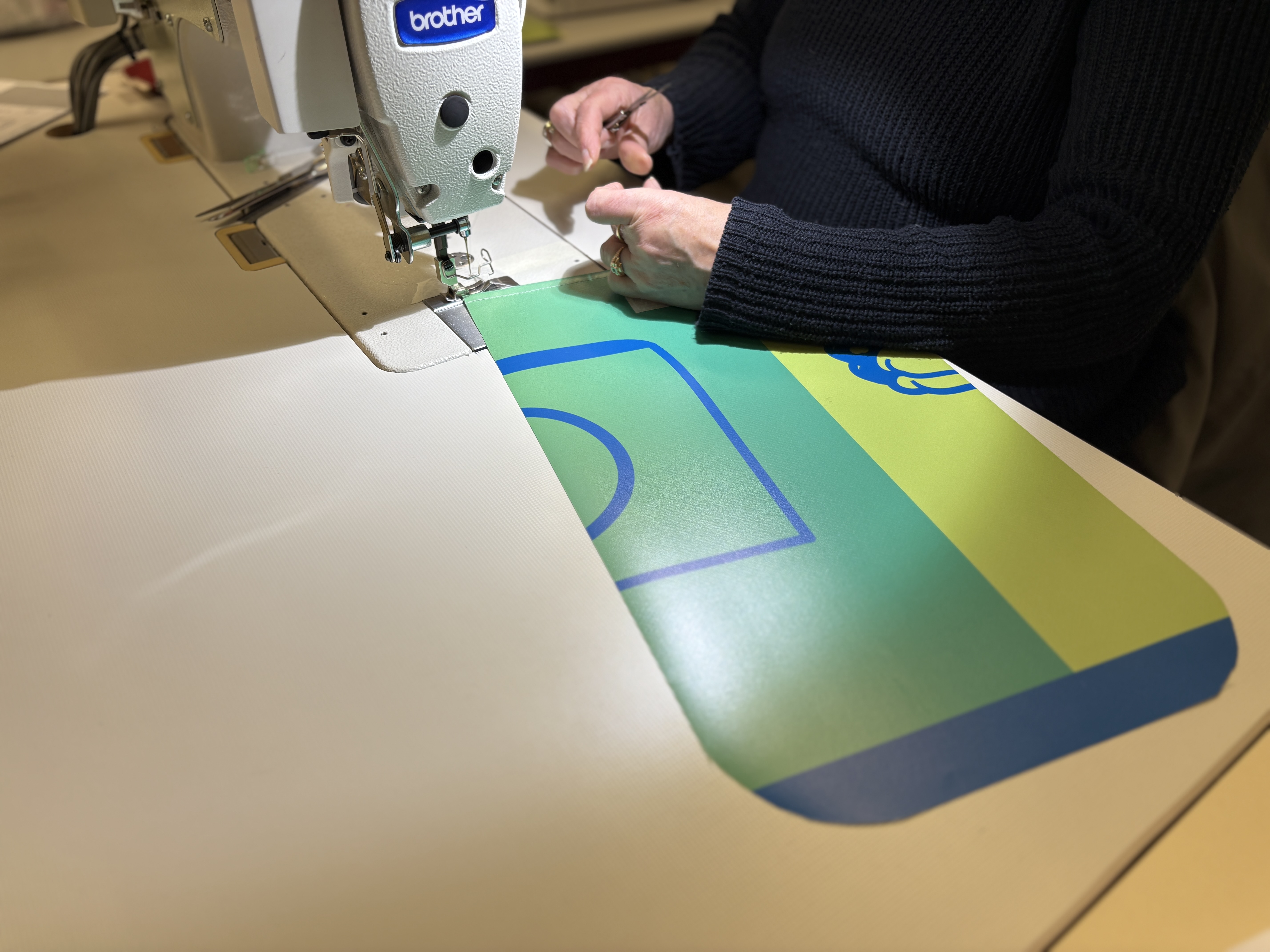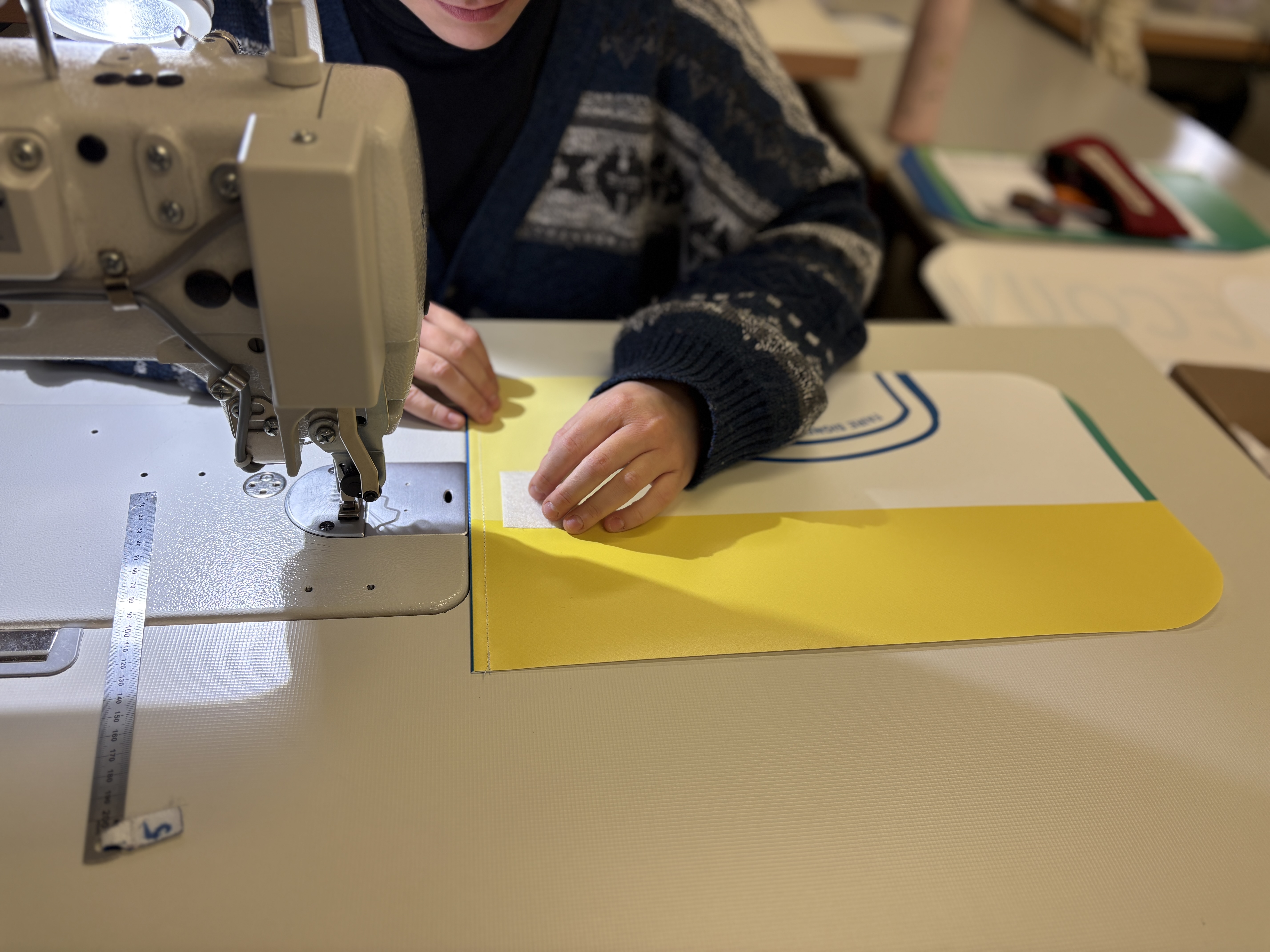 La fabrication a été confiée à un atelier spécialisé dans l’upcycling, situé près de Nantes, qui emploie des couturiers et couturières en insertion professionnelle. Ce choix permet de donner une dimension sociale forte au projet, en favorisant l’emploi et la réinsertion par le travail.