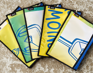 Les bâches ont été récupérées puis transformées en housses d’ordinateur et pochettes sur mesure, conçues à partir de ces matériaux initialement destinés à être jetés. Chaque pièce devient ainsi unique, tout en conservant la robustesse et la résistance propres aux bâches publicitaires.